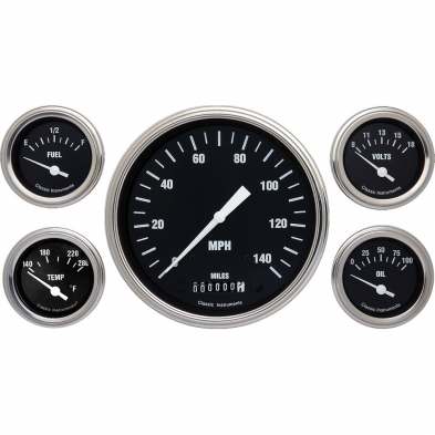The Hot Rods Series 5 Gauge Kit includes 4-5/8" Speedometer and 2-1/8" Fuel, Oil, Temp and Volt Gauges with Stainless Low Step Bezels and Flat Glass Lens.