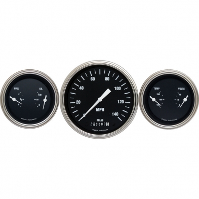 The Hot Rods Series 3 Gauge Kit includes 4-5/8" Speedo plus 2 3-3/8" Dual Gauges(Fuel and Oil plus Temp and Volt) with Stainless Low Step Bezels and Curved Glass Lens.