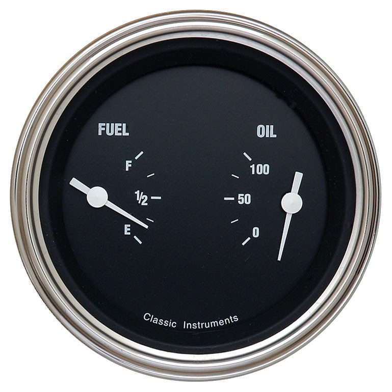 The Hot Rods Series 3-3/8" Dual Fuel and Oil Gauge Stainless Low Step Bezels and Flat Glass Lens.