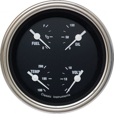 The Hot Rods Series 3-3/8" Quad Gauge Temp, Volt, Fuel (240-33 ohm) and Oil Stainless Low Step Bezels and Flat Glass Lens.