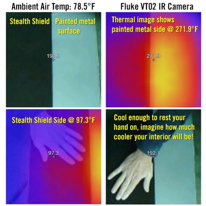 HP Stealth Shield™ uses proprietary technology developed for Heatshield Products welding blankets. This results in a revolutionary product that’s only 1/8 inch thick. It is designed to mount inside your vehicle atop the floor or sound-deadening product to protect you from heat radiating from the engine and exhaust.