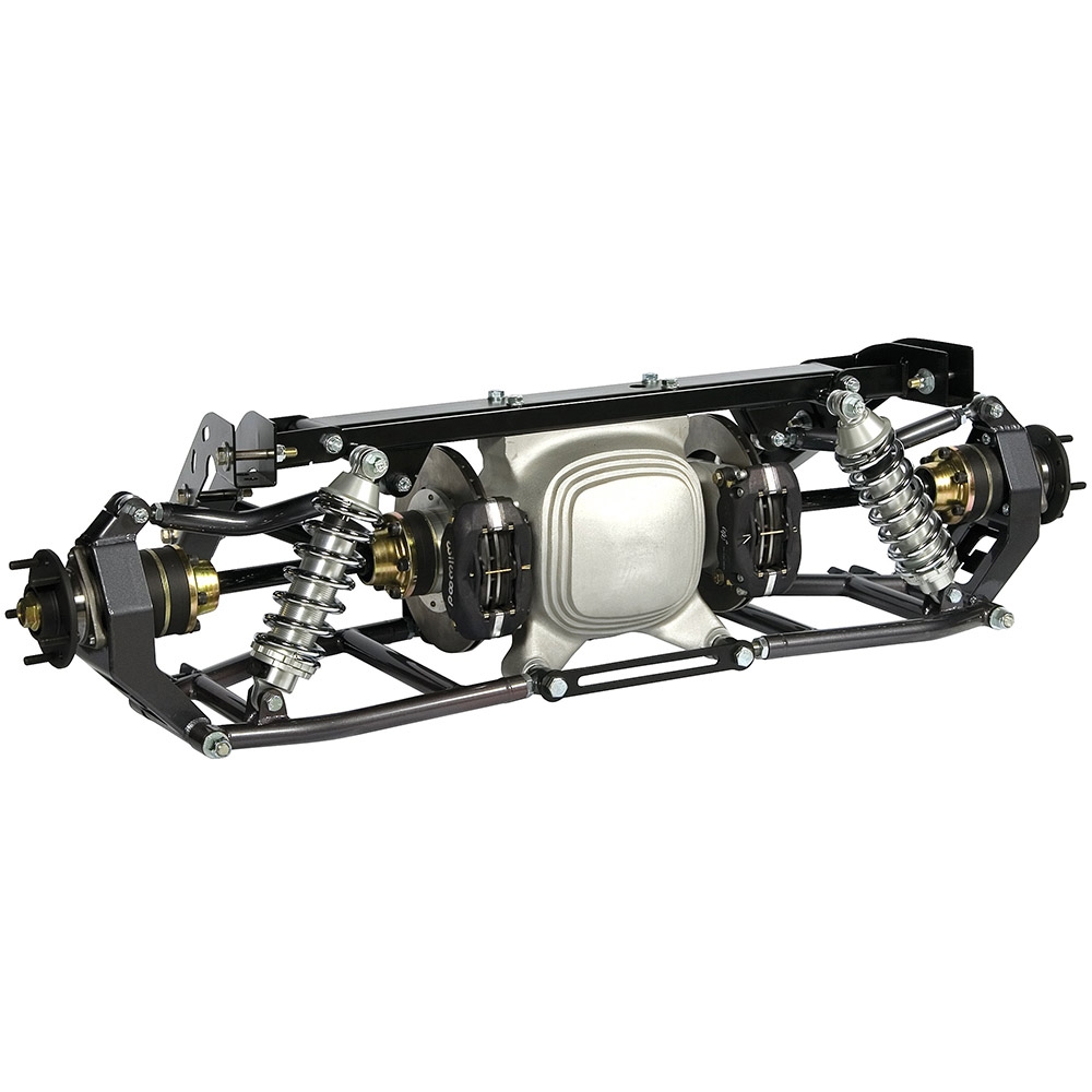 This is a bolt on 1967-69 Camaro and Firebird high horse independent rear suspension with drilled and slotted rotors. Included are steel uprights, upper and lower tubular control arms and billet 9" housing. This kit also features billet single adjustable coil over shocks with chrome springs and your choice of polished, red or black Wilwood 4-piston calipers (please state color choice of calipers). Your choice of gear ratio posi 3rd member and subframe connectors. This kit is 58" hub to hub to allow for a wider wheel and more wheel options.
