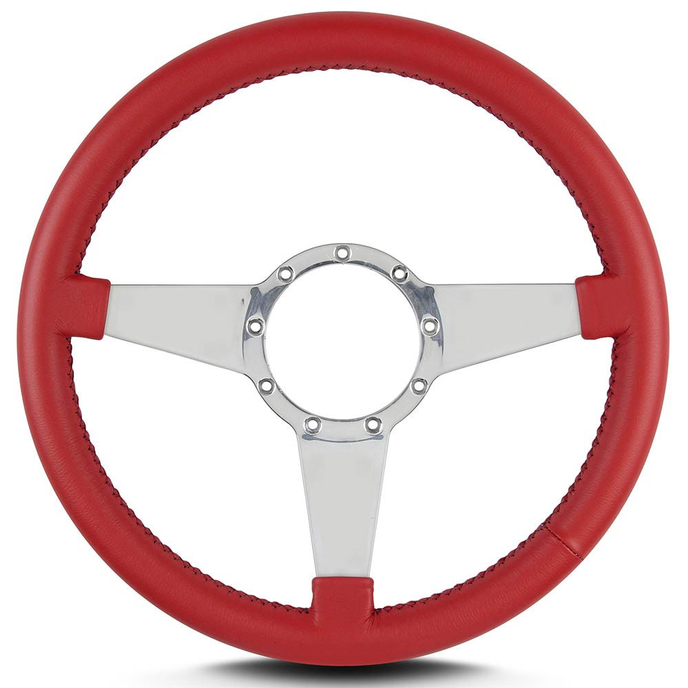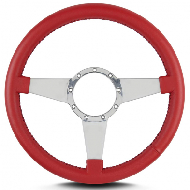 This is a Lecarra Mark IV Standard 14" Steering Wheel, it has 3 solid aluminum spokes without any holes or slots. This steering wheel has polished spokes and a Bright Red Leather Grip. These start out with one piece of 6061 T-6 aircraft grade of billet aluminum that is cut out as one piece of aluminum so there are no welds.