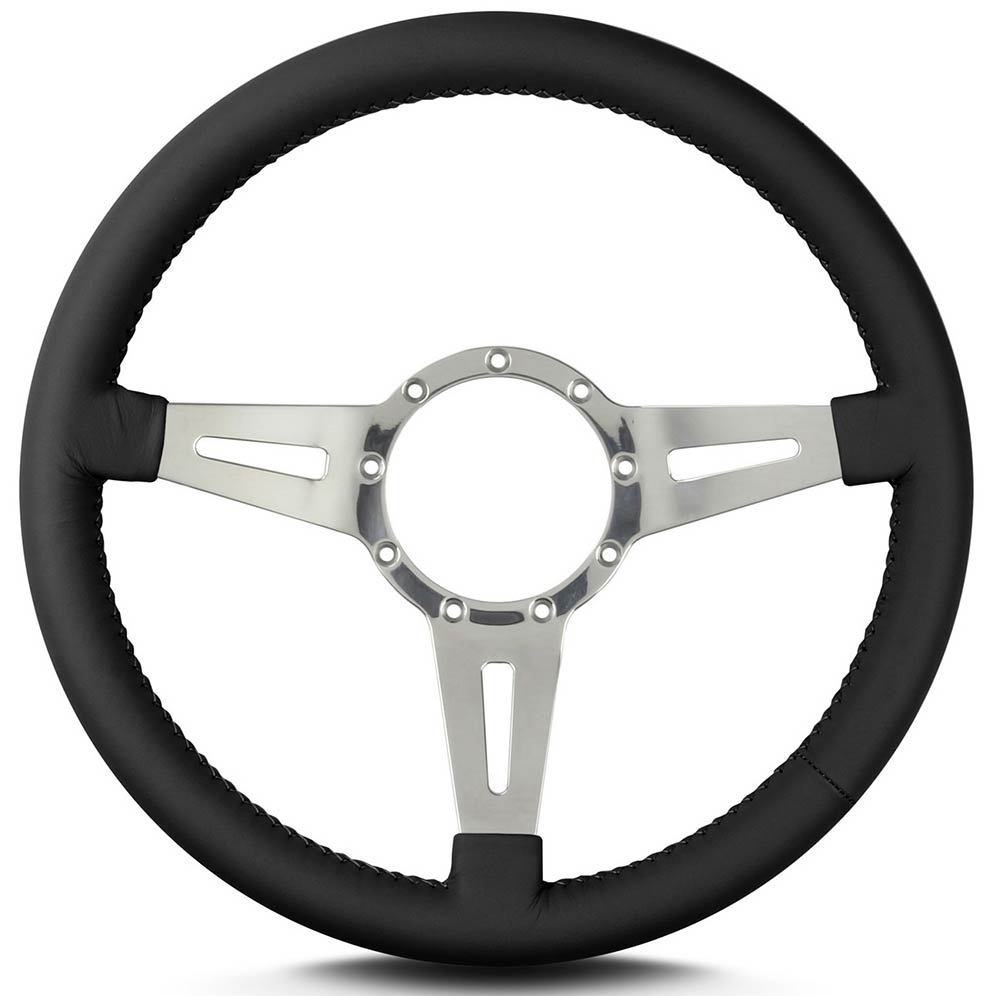 This is a Lecarra Mark IV Elegante 14" Steering Wheel, it has 3 aluminum spokes with single slots in each spoke. This steering wheel has polished spokes and a Black Leather Grip. These start out with one piece of 6061 T-6 aircraft grade of billet aluminum that is cut out as one piece of aluminum so there are no welds.