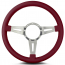 This is a Lecarra Mark IV Elegante 14" Steering Wheel, it has 3 aluminum spokes with single slots in each spoke. This steering wheel has polished spokes and a Burgundy Leather Grip. These start out with one piece of 6061 T-6 aircraft grade of billet aluminum that is cut out as one piece of aluminum so there are no welds.