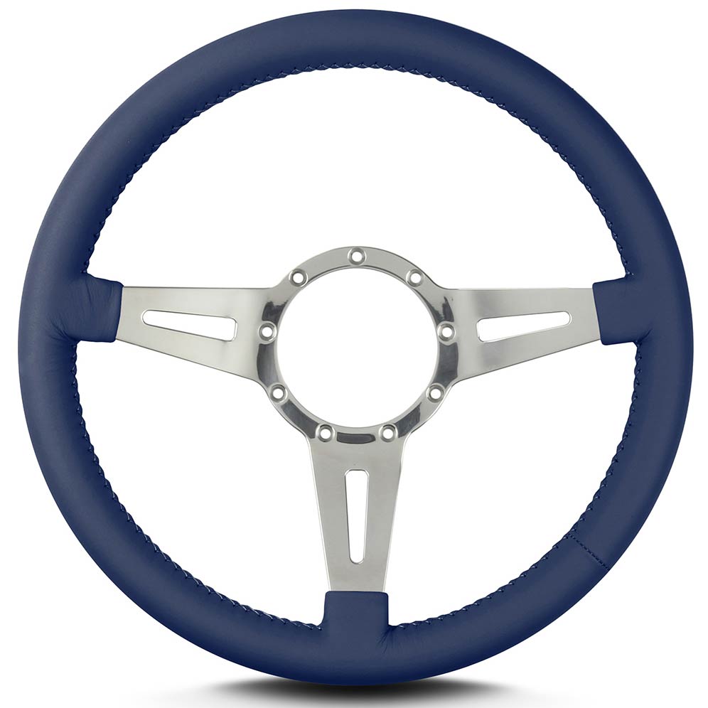 This is a Lecarra Mark IV Elegante 14" Steering Wheel, it has 3 aluminum spokes with single slots in each spoke. This steering wheel has polished spokes and a Navy Blue Leather Grip. These start out with one piece of 6061 T-6 aircraft grade of billet aluminum that is cut out as one piece of aluminum so there are no welds.