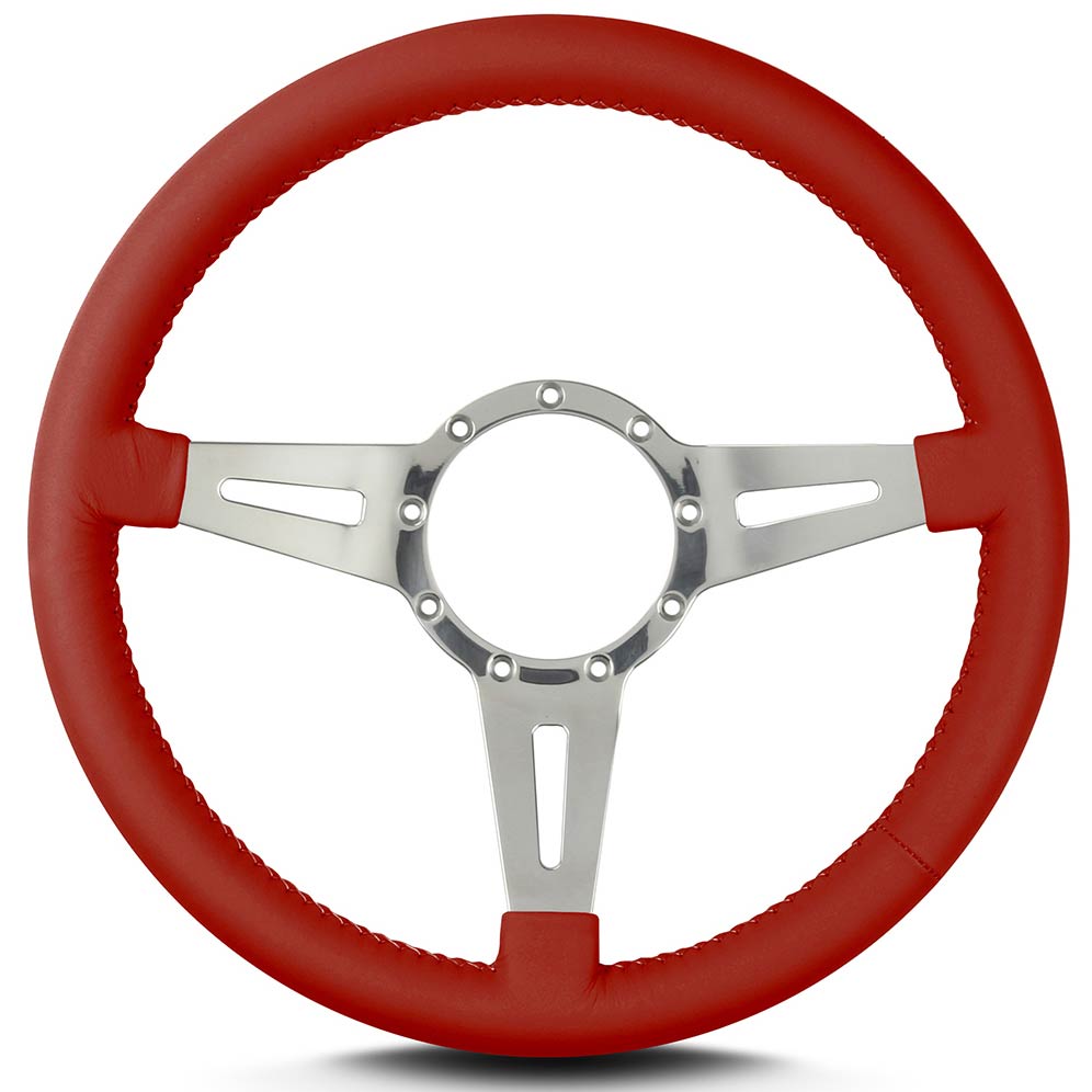 This is a Lecarra Mark IV Elegante 14" Steering Wheel, it has 3 aluminum spokes with single slots in each spoke. This steering wheel has polished spokes and a Bright Red Leather Grip. These start out with one piece of 6061 T-6 aircraft grade of billet aluminum that is cut out as one piece of aluminum so there are no welds.