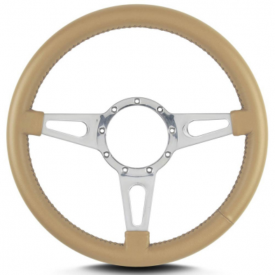 This is a Lecarra Mark IV Supreme 14" Steering Wheel, it has 3 aluminum spokes with single teardrop shaped slot in each spoke. This steering wheel has polished spokes and a Tan Leather Grip. These start out with one piece of 6061 T-6 aircraft grade of billet aluminum that is cut out as one piece of aluminum so there are no welds.