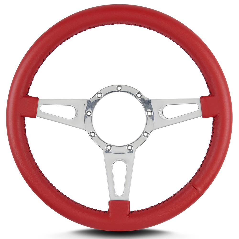 This is a Lecarra Mark IV Supreme 14" Steering Wheel, it has 3 aluminum spokes with single teardrop shaped slot in each spoke. This steering wheel has polished spokes and a Bright Red Leather Grip. These start out with one piece of 6061 T-6 aircraft grade of billet aluminum that is cut out as one piece of aluminum so there are no welds.