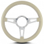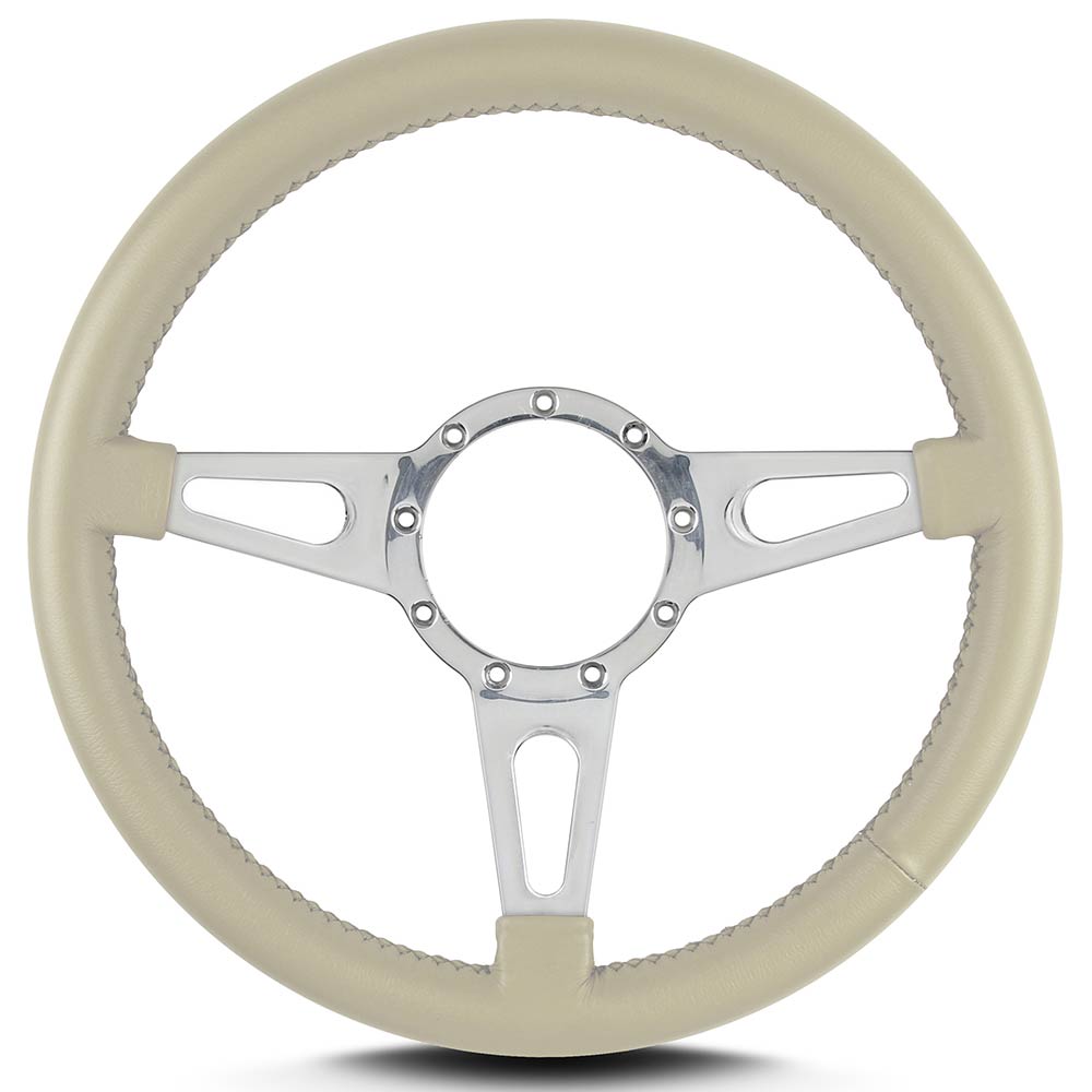 This is a Lecarra Mark IV Supreme 14" Steering Wheel, it has 3 aluminum spokes with single teardrop shaped slot in each spoke. This steering wheel has polished spokes and a Bone Leather Grip. These start out with one piece of 6061 T-6 aircraft grade of billet aluminum that is cut out as one piece of aluminum so there are no welds.