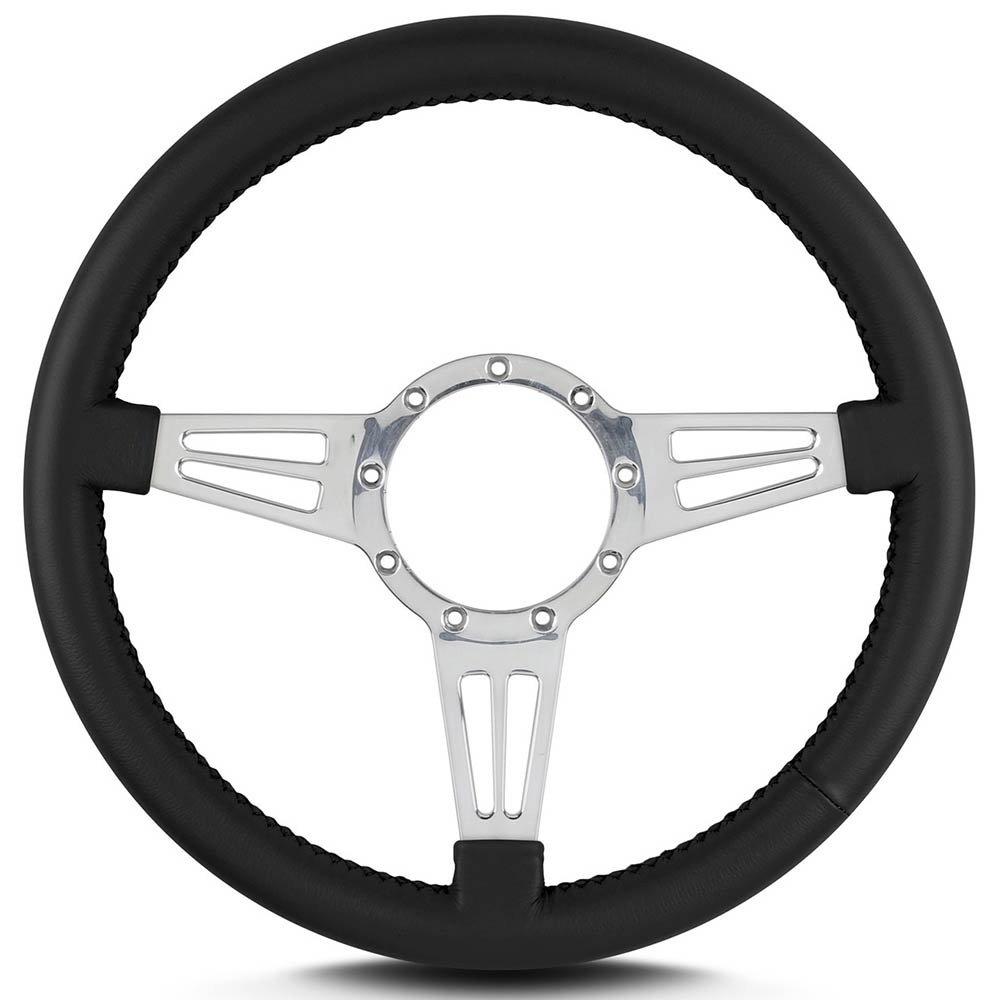 This is a Lecarra Mark IV Double Slot 14" Steering Wheel, it has 3 aluminum spokes with 2 slots in each spoke. This steering wheel has polished spokes and a Black Leather Grip. These start out with one piece of 6061 T-6 aircraft grade of billet aluminum that is cut out as one piece of aluminum so there are no welds.