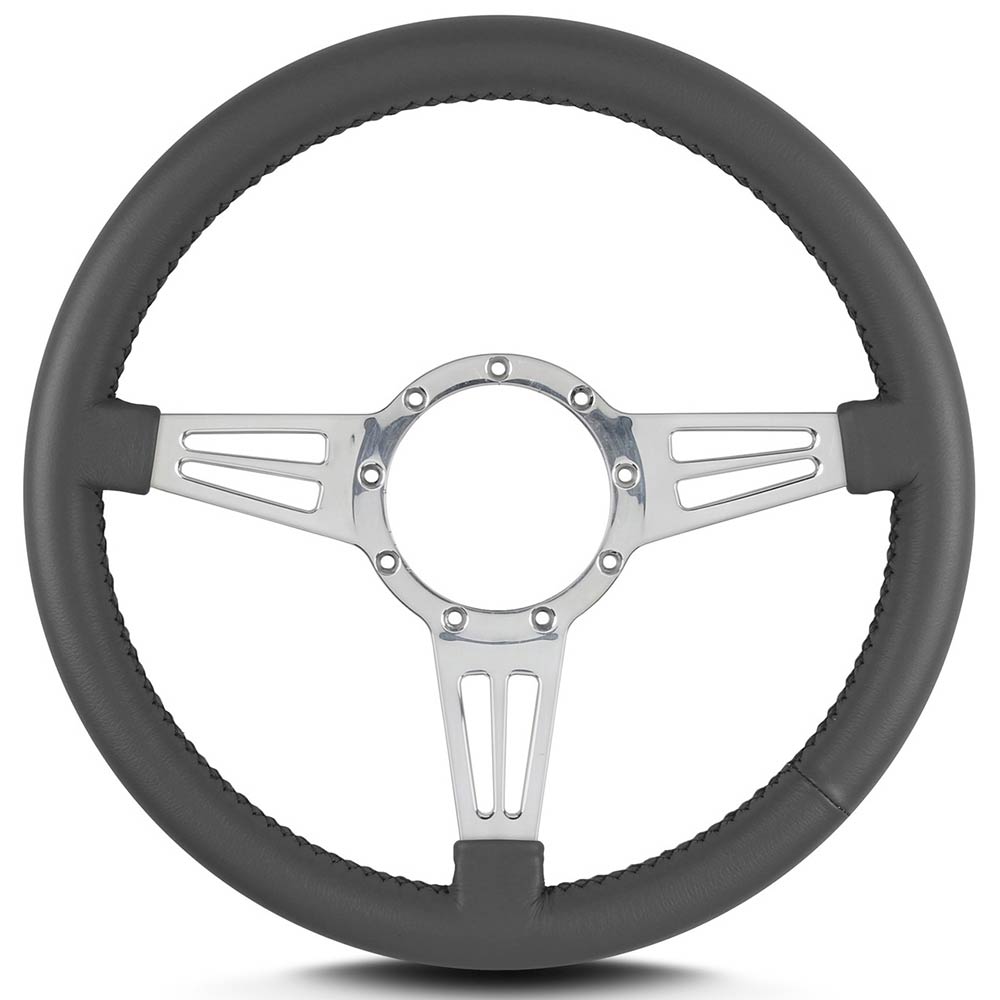 This is a Lecarra Mark IV Double Slot 14" Steering Wheel, it has 3 aluminum spokes with 2 slots in each spoke. This steering wheel has polished spokes and a Charcoal Leather Grip. These start out with one piece of 6061 T-6 aircraft grade of billet aluminum that is cut out as one piece of aluminum so there are no welds.