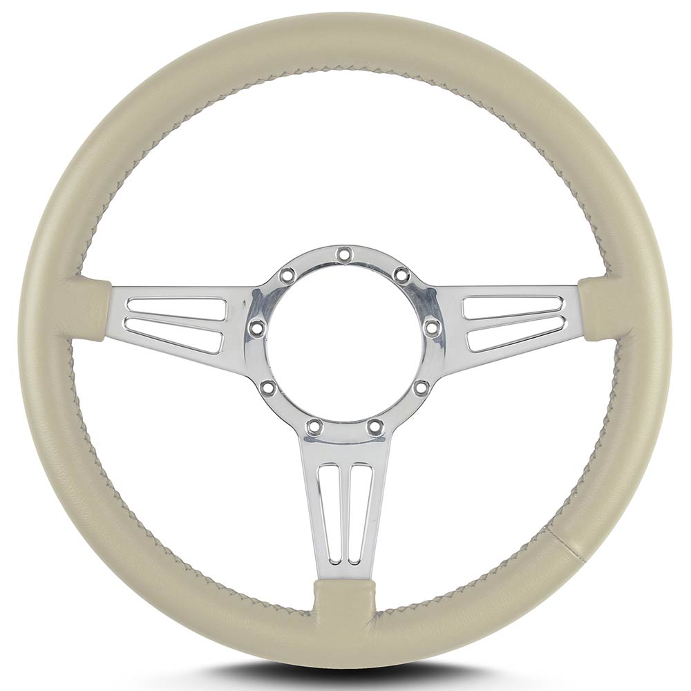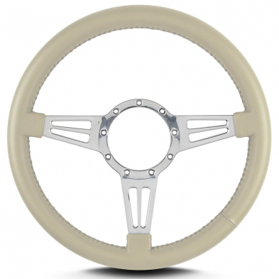 This is a Lecarra Mark IV Double Slot 14" Steering Wheel, it has 3 aluminum spokes with 2 slots in each spoke. This steering wheel has polished spokes and a Bone Leather Grip. These start out with one piece of 6061 T-6 aircraft grade of billet aluminum that is cut out as one piece of aluminum so there are no welds.