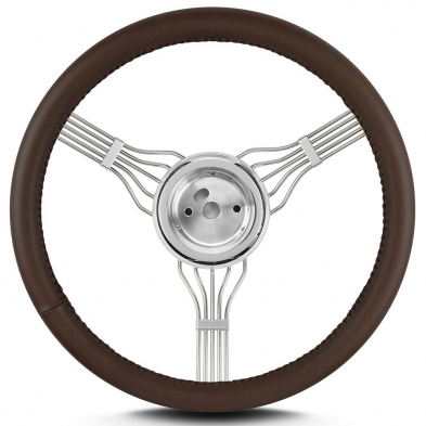 This is a beautiful combination of traditional styling and modern machining. This one piece wheel is built into a machined GM column adapter. Accommodates any Lecarra horn buttons. This 15" Banjo style steering wheel has 1-1/2" less dish to allow for more drivers clearance. Please note this steering wheels grip is covered in Brown Leather.