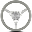 This is a beautiful combination of traditional styling and modern machining. This one piece wheel is built into a machined GM column adapter. Accommodates any Lecarra horn buttons. This 15" Banjo style steering wheel has 1-1/2" less dish to allow for more drivers clearance. Please note this steering wheels grip is covered in Dove Grey Leather.