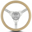 This is a beautiful combination of traditional styling and modern machining. This one piece wheel is built into a machined GM column adapter. Accommodates any Lecarra horn buttons. This 15" Banjo style steering wheel has 1-1/2" less dish to allow for more drivers clearance. Please note this steering wheels grip is covered in Tan Leather.