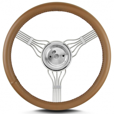 This is a beautiful combination of traditional styling and modern machining. This one piece wheel is built into a machined GM column adapter. Accommodates any Lecarra horn buttons. This 15" Banjo style steering wheel has 1-1/2" less dish to allow for more drivers clearance. Please note this steering wheels grip is covered in Chestnut Leather.