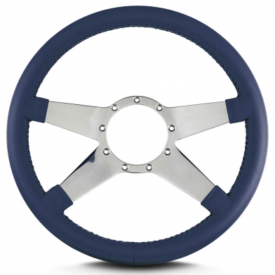 This is a Lecarra Mark 9 Standard 14" Steering Wheel, it has 4 aluminum spokes with smooth spokes. This steering wheel has polished spokes and a Navy Blue Leather Grip. These start out with one piece of 6061 T-6 aircraft grade of billet aluminum that is cut out as one piece of aluminum so there are no welds.