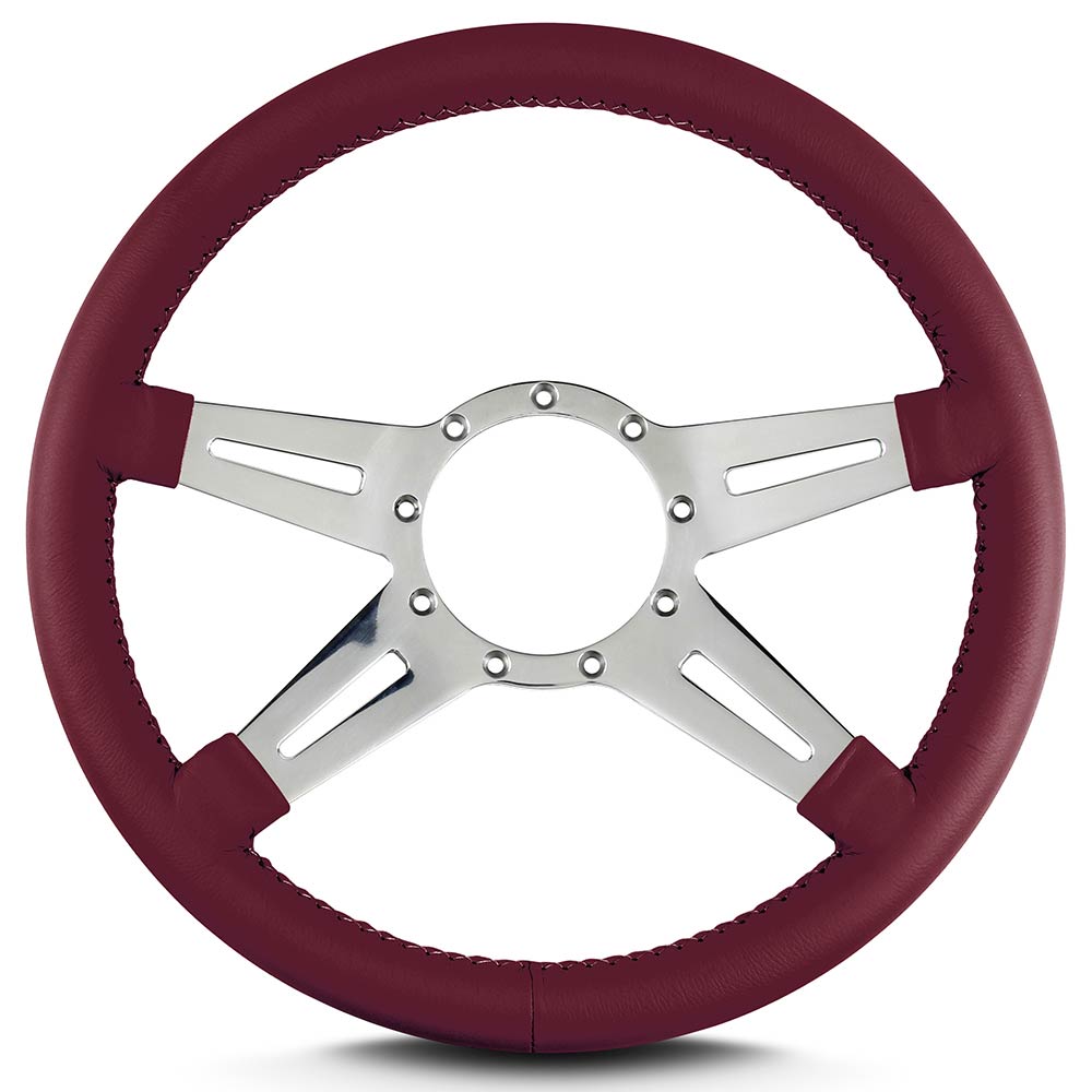This is a Lecarra Mark 9 Elegante 14" Steering Wheel, it has 4 aluminum spokes with a single slot in each spoke. This steering wheel has polished spokes and a Burgundy Leather Grip. These start out with one piece of 6061 T-6 aircraft grade of billet aluminum that is cut out as one piece of aluminum so there are no welds.