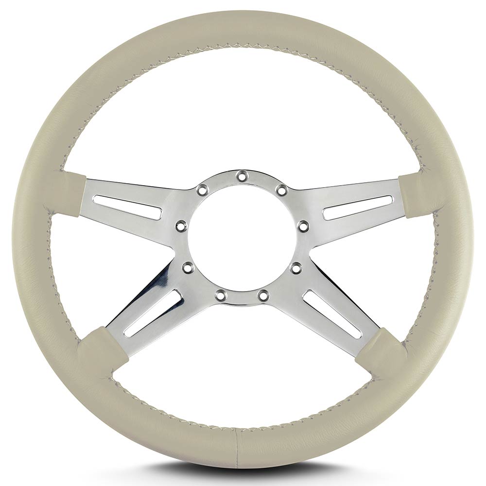 This is a Lecarra Mark 9 Elegante 14" Steering Wheel, it has 4 aluminum spokes with a single slot in each spoke. This steering wheel has polished spokes and a Bone Leather Grip. These start out with one piece of 6061 T-6 aircraft grade of billet aluminum that is cut out as one piece of aluminum so there are no welds.