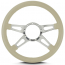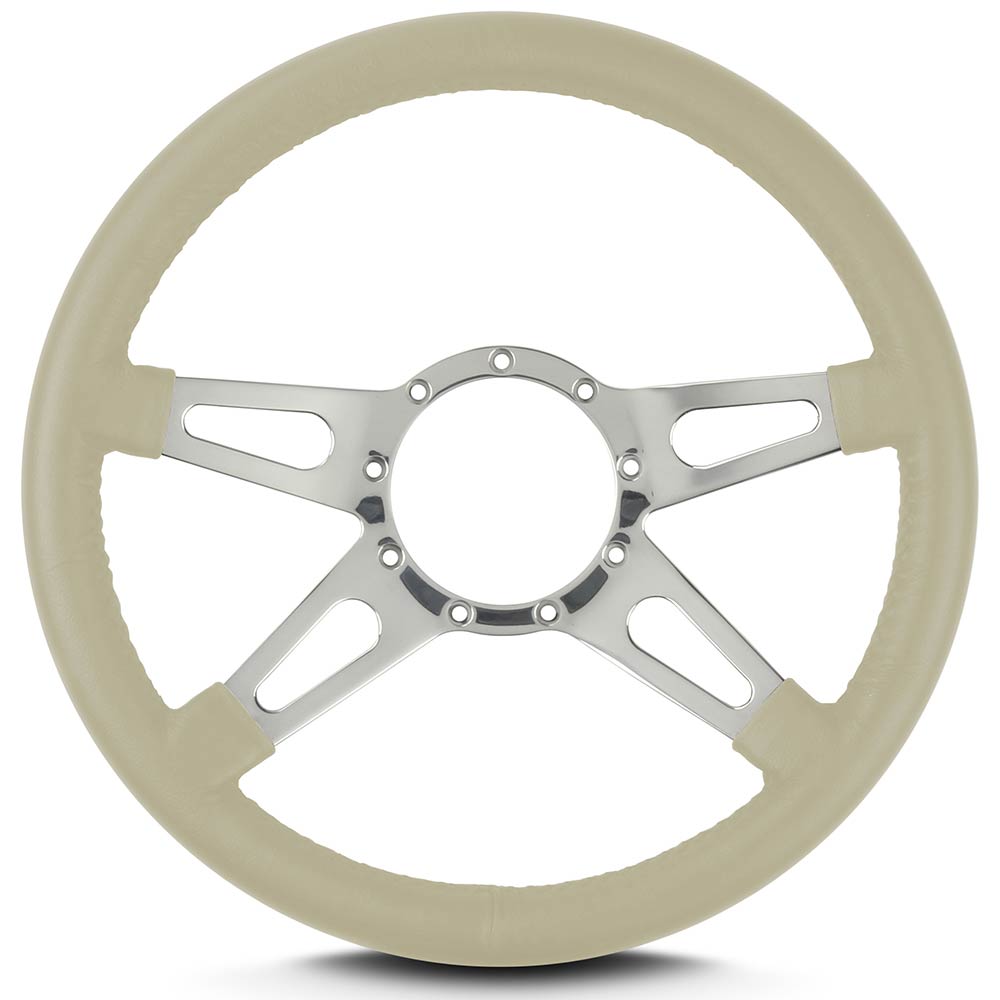 This is a Lecarra Mark 9 Supreme 14" Steering Wheel, it has 4 aluminum spokes with a single teardrop slot in each spoke. This steering wheel has polished spokes and a Bone Leather Grip. These start out with one piece of 6061 T-6 aircraft grade of billet aluminum that is cut out as one piece of aluminum so there are no welds.