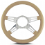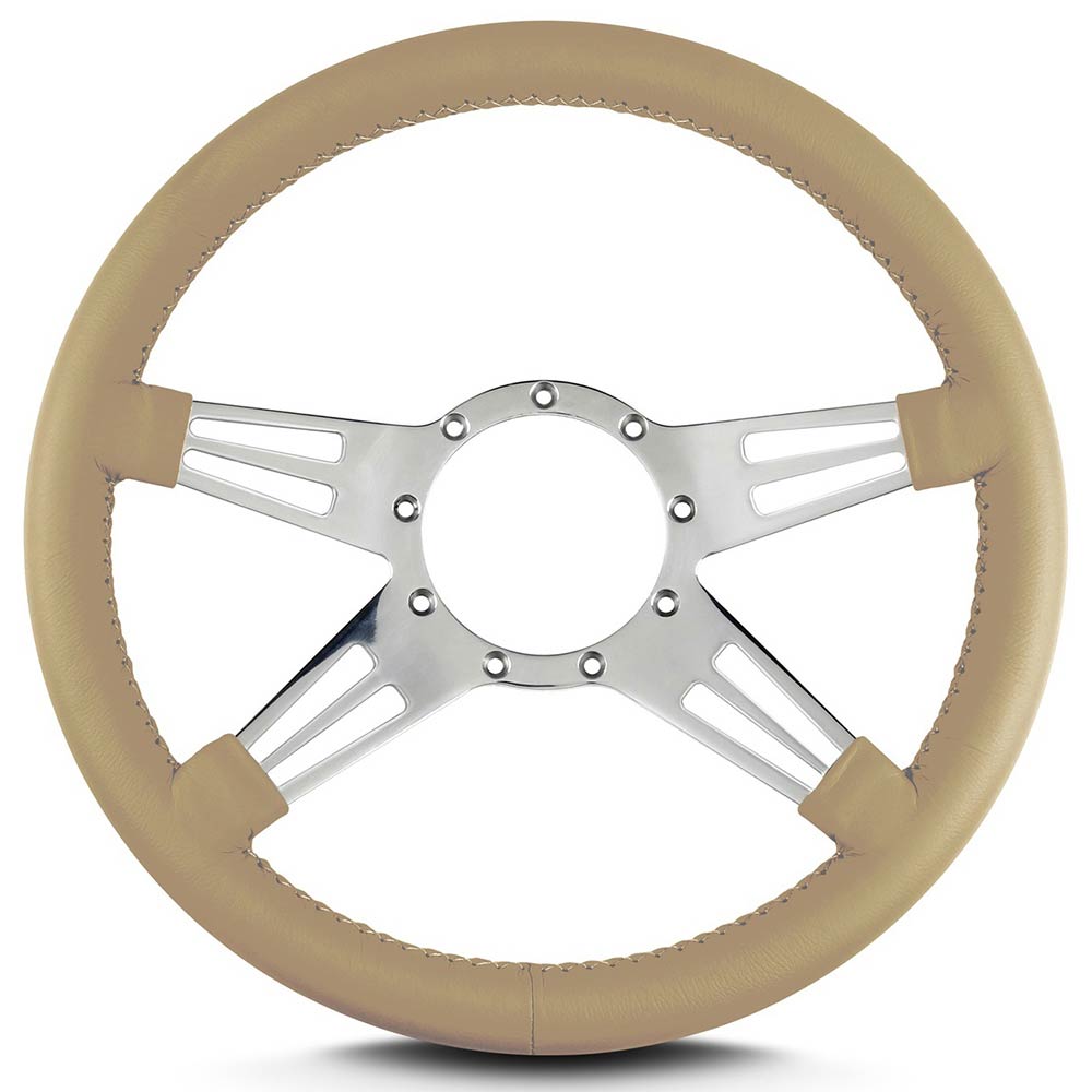 This is a Lecarra Mark 9 Double Slot 14" Steering Wheel, it has 4 aluminum spokes with a 2 slots per spoke. This steering wheel has polished spokes and a Tan Leather Grip. These start out with one piece of 6061 T-6 aircraft grade of billet aluminum that is cut out as one piece of aluminum so there are no welds.