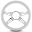 This is a Lecarra Mark 9 Double Slot 14" Steering Wheel, it has 4 aluminum spokes with a 2 slots per spoke. This steering wheel has polished spokes and a White Leather Grip. These start out with one piece of 6061 T-6 aircraft grade of billet aluminum that is cut out as one piece of aluminum so there are no welds.