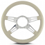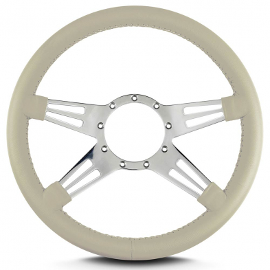 This is a Lecarra Mark 9 Double Slot 14" Steering Wheel, it has 4 aluminum spokes with a 2 slots per spoke. This steering wheel has polished spokes and a Bone Leather Grip. These start out with one piece of 6061 T-6 aircraft grade of billet aluminum that is cut out as one piece of aluminum so there are no welds.
