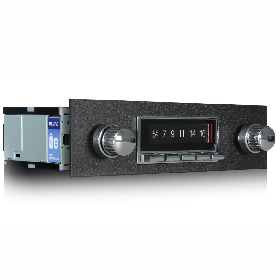 The USA-740 offers the same classic look that Custom Autosound has always been known for with today’s latest features. Now, with built-in Bluetooth (microphone included), answer calls and get Bluetooth streaming music from your Bluetooth capable phone or Bluetooth compatible device. Match the dominant color of your instrument cluster with user selectable multiple LCD color choices with LCD dimmer control. The AM/FM RDS tuner shows station, song and artist on the LCD display. Fully controls optional CD-1 CD player. Classic style with today’s sound and performance taking every road and curve with you in your vintage vehicle.