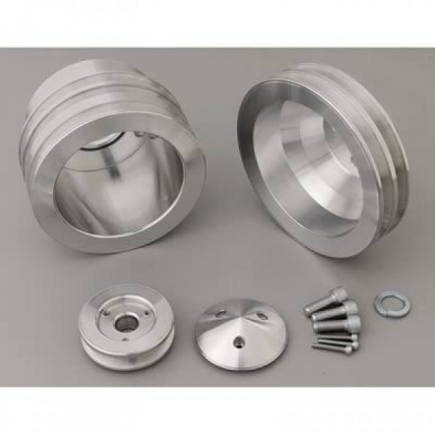 This Aluminum Triple Groove Performance Ratio V-Belt Pulley Kit for Ford 289, 302, 351W with 3 Bolt Damper and Standard Rotation Water Pump with Passenger Side Lower Radiator Hose is Designed to Replace Factory V-belt or Steel Serpentine Pulleys. This pulley set has a 3-7/8" Water Pump Flange to Damper Face Measurement.