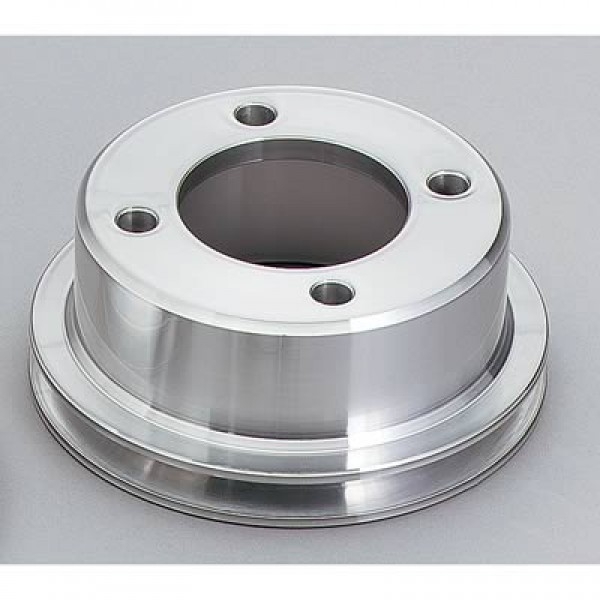 Aluminum Single Groove Crank Pulley for Ford Small Block 289, 302, 351W, 351C, 351M and 400M engines with 4 Bolt Damper and Standard Rotation Water Pump and Driver Side Lower Radiator Hose. Designed to Replace Factory V-belt or Steel Serpentine Pulleys.