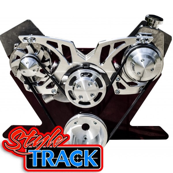 March Style Track serpentine system is created with a combination of style and low price that is sure to find favor among car enthusiasts everywhere. The highly styled one piece alternator and air conditioning bracket provides a rigid support for the alternator and a/c compressor; a separate bracket allows the option of power steering or no power steering.