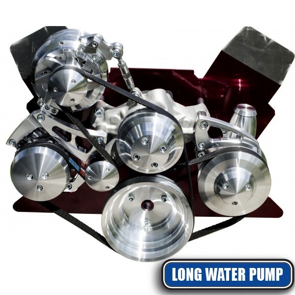 Features alternator, power steering bracket and low A/C on the passenger side, this pulley and bracket kit for Chevy big block engines looks clean and compact. CNC machined from solid billet 6061-T6 aluminum. The Ultra comes with options for driver side A/C mounts, a larger crank pulley and a power steering kit option, so you can get the exact kit you need for your vehicle. ;This kit uses a 7.287" standard rotation long water pump.
