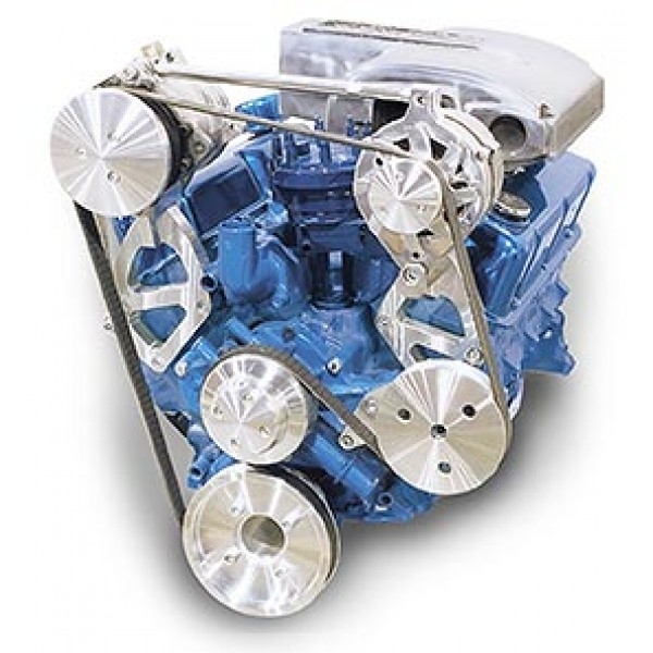 This Deluxe Street Rod pulley and bracket system specifically designed around 1994-95 Mustang short water pumps! Machined from solid billet 6061-T6 aluminum. This Deluxe Street Rod pulley and bracket system with improved engine-to-radiator clearance for your Ford 289, 302, and 351 Windsor.