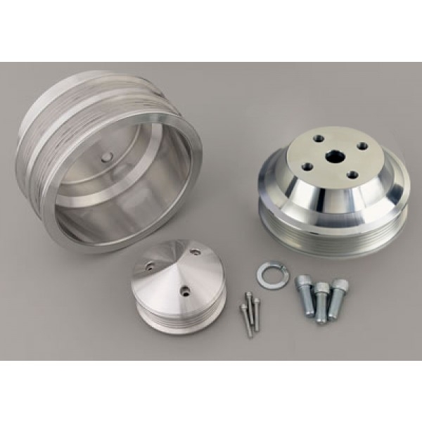 This Double 6-Rib Aluminum Serpentine Ratio Pulley Kit for Chevy Big Blocks with Standard Rotation Long Water Pump with a 7.287" Engine Block to Water Pump Flange Measurement. Designed to Replace Factory V-belt or Steel Serpentine Pulleys.
