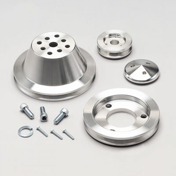 This Aluminum Single Groove High Water Flow Ratio V-Belt Pulley Kit for Chevy Big Blocks with Standard Rotation Short Water Pump and a Engine Block to Water Pump Flange Measurement of 5.75". Designed to Replace Factory V-belt or Steel Serpentine Pulleys.