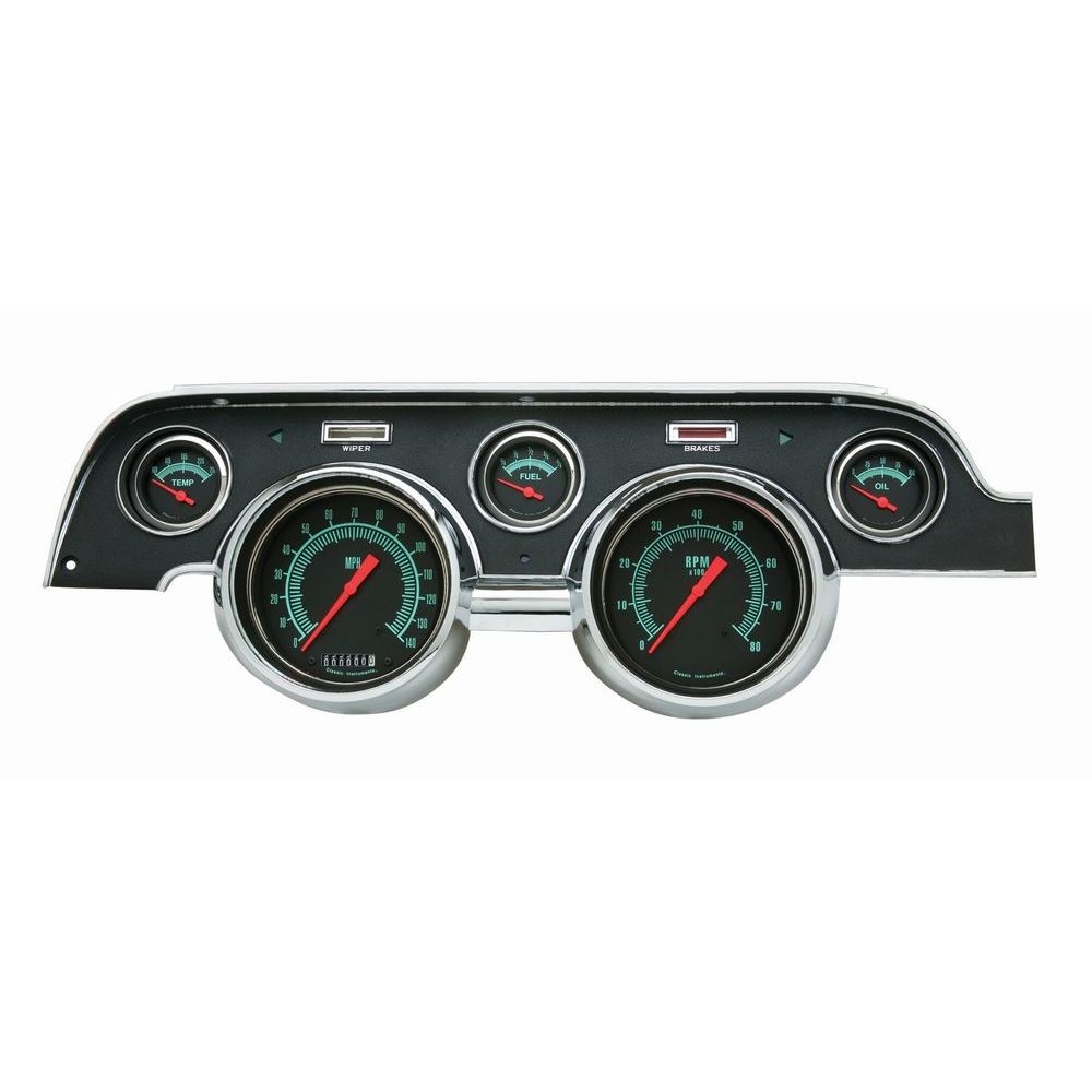 The 1967-68 Mustang G-Stock Series Gauge Package with OEM Style Black Camera Case Bezel and 3-3/8" Speedometer and 2-1/8" Fuel (75-10 ohm), Oil, Temp and Volt Gauges. The package is complete with necessary sending units.