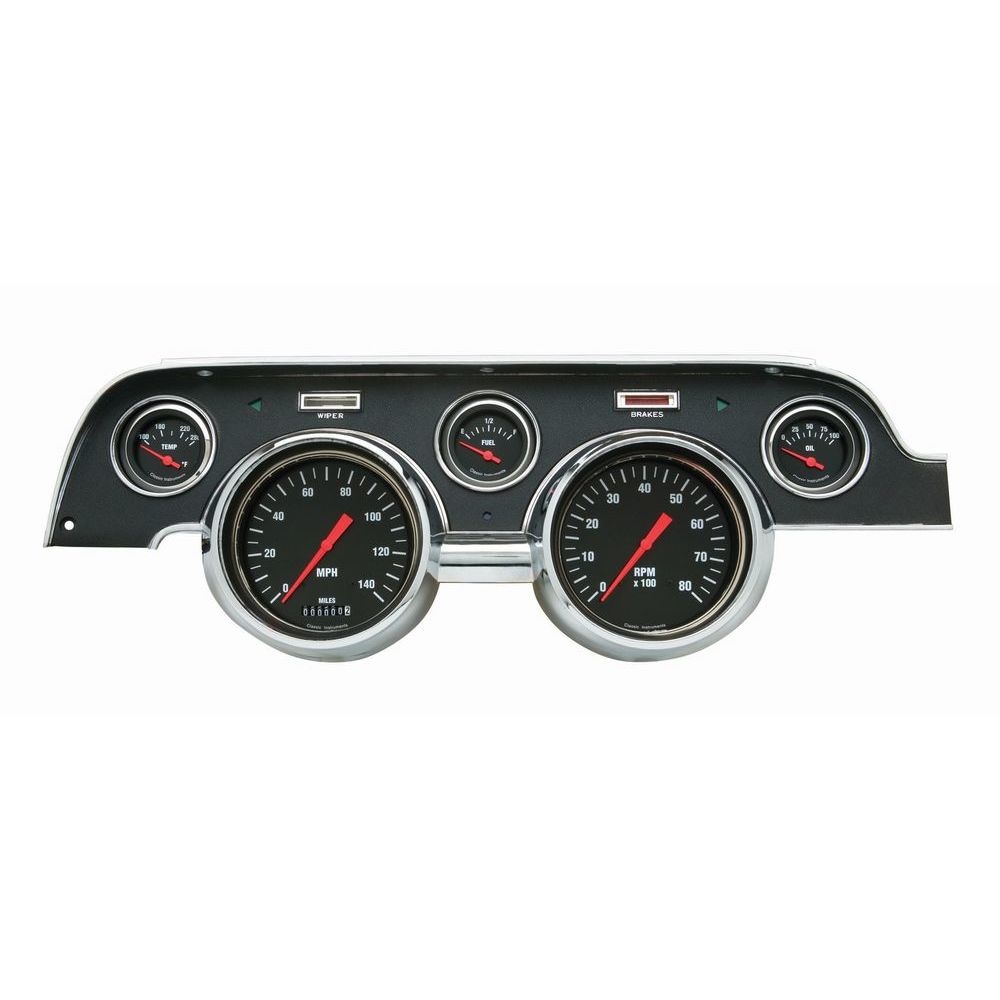 The 1967-68 Mustang Hot Rod Black Series Gauge Package with OEM Style Black Camera Case Bezel and 3-3/8" Speedometer and 2-1/8" Fuel (75-10 ohm), Oil, Temp and Volt Gauges. The package is complete with necessary sending units.