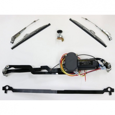 Complete wiper system for the 1938 Ford Car. This system is a replacement for the original small vacuum wiper motor. The system comes complete with a heavy duty 2-speed motor, linkage and transmissions, Polished Stainless Steel wiper arms and blades and a drill jig fixture to drill and enlarge the passenger side hole and enlarge the driver side hole. The kit is designed to give the most sweep and install with great ease. The kit is guaranteed for a full 3-years and has been time tested under extreme conditions. 12 volt wiring is required.