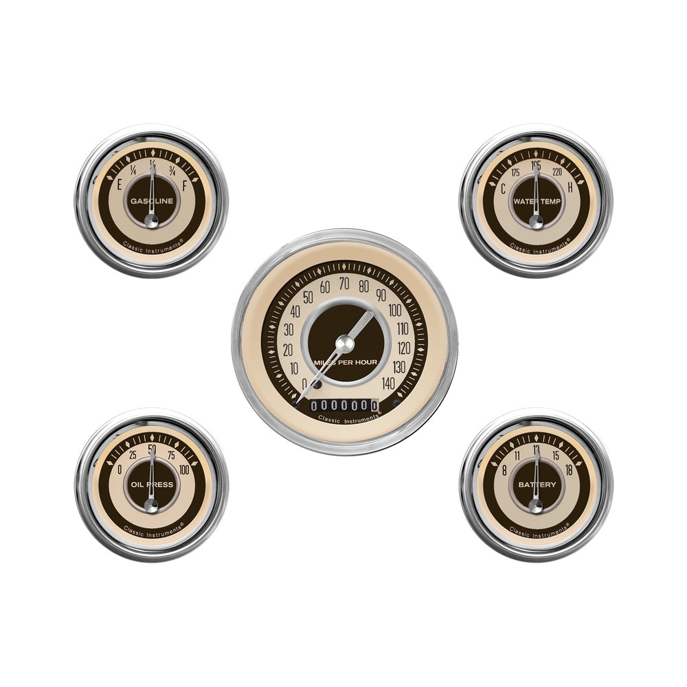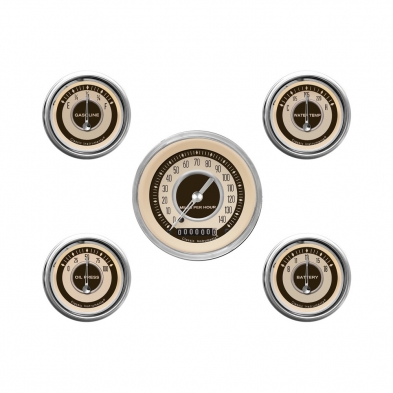 The 5 Gauges Nostalgia VT Series Kit includes a 3-3/8" Speedo and 2-1/8" Fuel, Oil, Temp and Volt Gauges with Stainless High Step Bezel Curved Glass Lens.