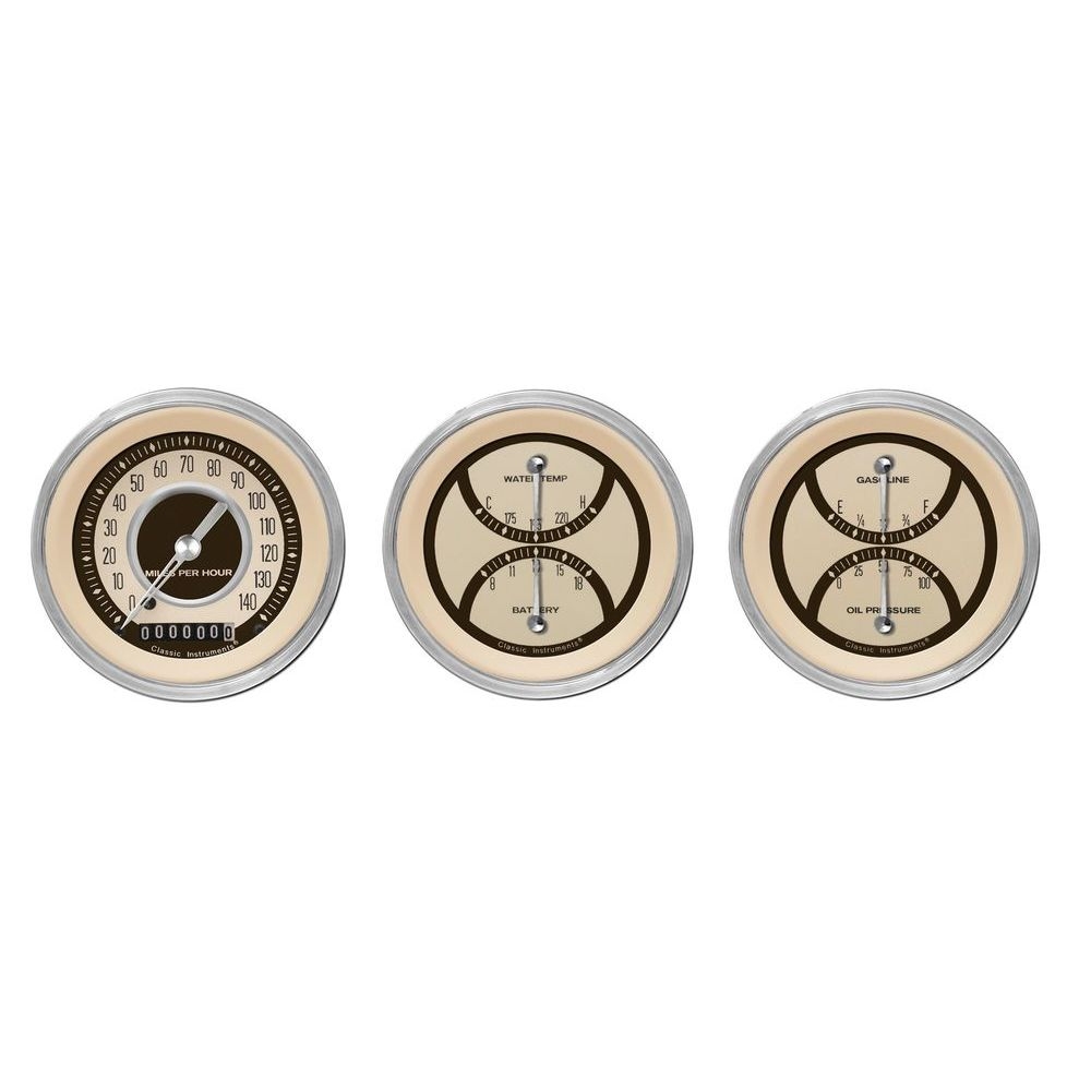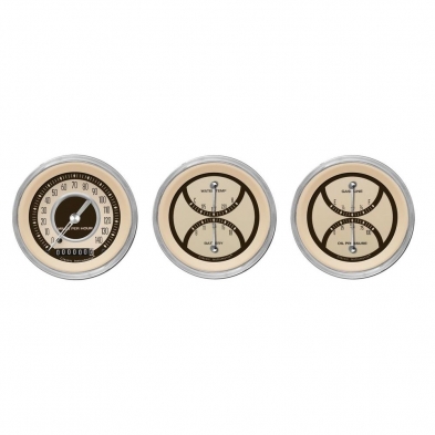 The 3 Gauges Nostalgia VT Series Kit includes 3-3/8" Speedo and 2 Dual Gauges (Gasoline and Oil Pressure plus Water Temp and Battery) with Stainless High Step Bezel Curved Glass Lens.