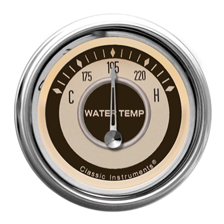 The Nostalgia VT Series 2-1/8" Water Temp Gauge with High Step Bezel and Curved Glass Lens.