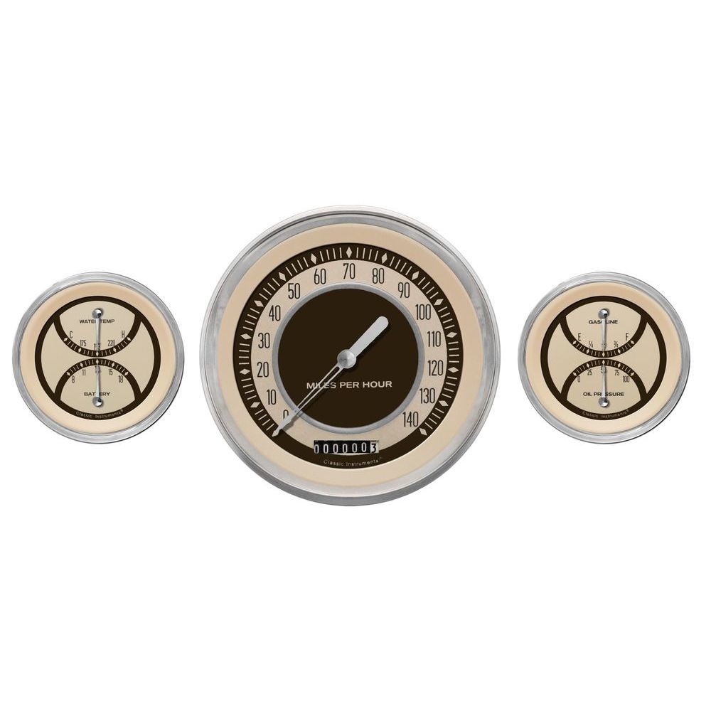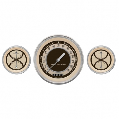 The 3 Gauges Nostalgia VT Series Kit includes 4-5/8" Speedo and 2 Dual Gauges (Gasoline and Oil Pressure plus Water Temp and Battery) with Stainless Low Step Bezel Curved Glass Lens.