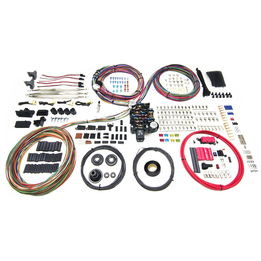 This harness features a grommet style firewall pass through with the fuse block mounted inside the vehicle on or near the firewall. The wires are pre-terminated using Packard factory crimping machines and utilize a grommet to pass through the firewall, keeping your wiring safe and protected from harsh metal edges. Each wire is extra length with up to 20’ of length to the front and over 25’ to the rear providing ample length for mounting your fuse block and freedom to route the wiring how you choose. After trimming to fit, utilize the provided terminals and connectors to terminate the ends.