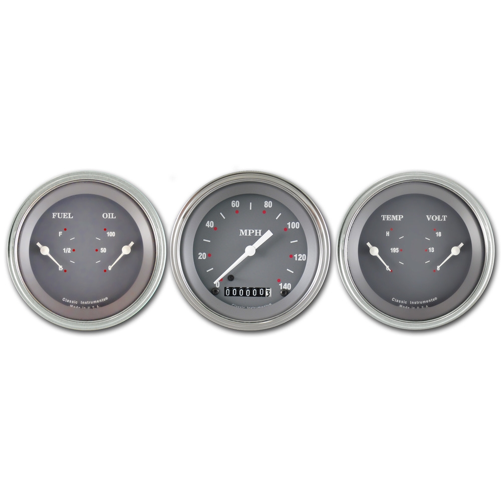 The SG Series 3 Gauge Kit includes a 3-3/8" Speedo and 2 Dual Gauges (Fuel and Oil plus Temp and Volts) with a Gray Face and White Numbers and Pointers that come with Stainless Low Step Bezels and Curved Glass Lens.