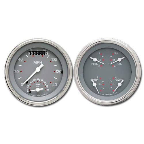 The SG Series 2 Gauge Kit includes a 3-3/8" Ultimate Speedo and Quad (Fuel, Oil, Temp and Volts) with a Gray Face and White Numbers and Pointers that come with Stainless Low Step Bezels and Curved Glass Lens.