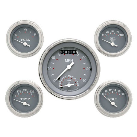 The SG Series 5 Gauge Kit includes a 3-3/8" Ultimate Speedo Speedo/Tach Combo and 4 2-1/8" Fuel, Oil, Temp and Volt Gauges with a Gray Face and White Numbers and Pointers that come with Stainless Low Step Bezels and Flat Glass Lens.