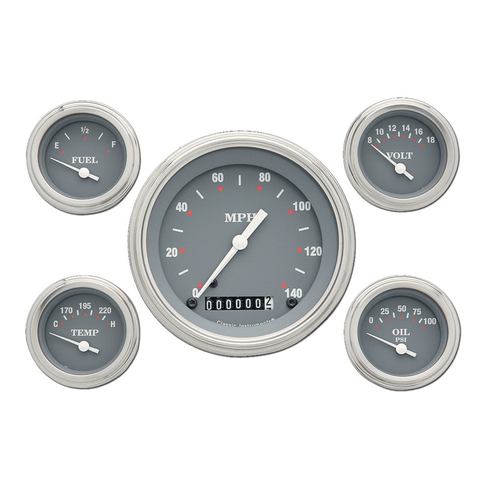 The SG Series 5 Gauge Kit includes a 4-5/8" Speedo and 4 2-1/8" Fuel, Oil, Temp and Volt Gauges with a Gray Face and White Numbers and Pointers that come with Stainless Low Step Bezels and Curved Glass Lens.