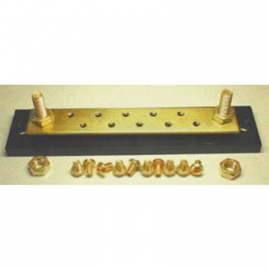 1-1/4" x 5-3/4" Grounding Strip has a solid brass bus bar, (2) 1/4" studs with nuts and (10) #8-32 Screws for ground contacts. Plastic insulator base has two countersunk holes for mounting.