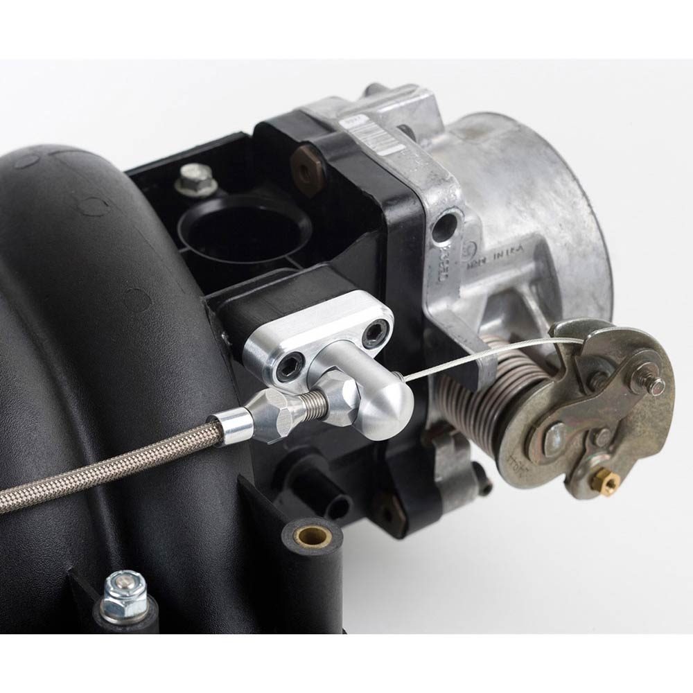 The bracket mounts to the side of the LS1 manifold. Use with Lokar throttle cable TC-1000HT, TC-1000U or XTC-1000HT.